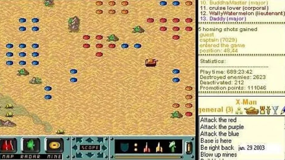 Battlefield était un jeu multijoueur en ligne où le joueur contrôlait un char appartenant à l’une des quatre équipes, se déplaçant sur la carte et tirant sur les ennemis. Le jeu se déroulait partiellement au tour par tour : tandis que le joueur donnait ses ordres en temps réel, les chars se déplaçaient tour à tour. Les chars pouvaient également se téléporter n’importe où sur la carte, poser des mines pour piéger les chars ennemis et utiliser un radar pour détecter les mines et les objets cachés.
